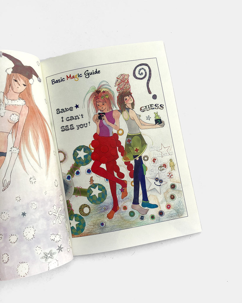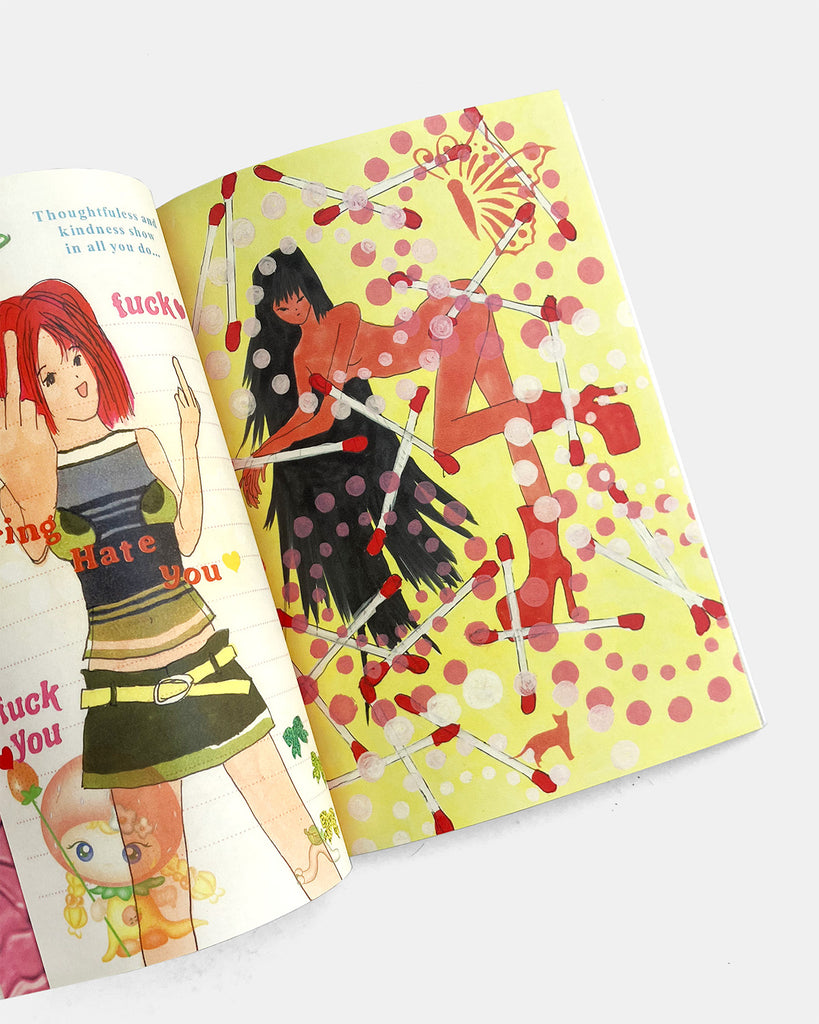 88 pages of drawings and photos by Niptong. A twin flame number. The DIY radio sign-off for “love and kisses.” Across the globe, audiences are lamenting being born torn apart from themselves—flames in search of twins, thought by Plato to have come out the womb in sets of twos…two hearts, two heads, four eyes, four arms, etcetera. In the vicinity of this absence and the costly search for re-conjoinment is Niptong. Niptong’s scenes, vibrant marker and pen drawings punctuated with stickers, digital illustrations, and photographs, are full of holes too: a circle, polkadot, wheel, asshole, urethra, Q-Tip implying an ear canal, a puppy-dog with shiny spinning saucer puppy-dog eyes. There are one, two, three, four holes in the number 88!