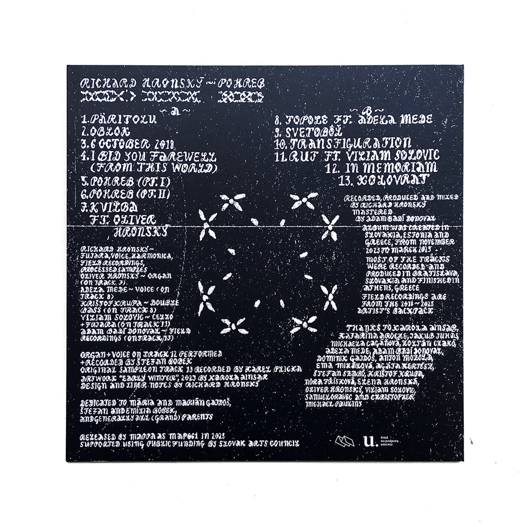 スロバキア・ブラチスラバ拠点の音楽家・アーティストRichard Hronskýが、実験音楽レーベル<Mappa>から2025年9月にリリースした作品。スロバキアの民族楽器で、長い木管楽器のフヤラはじめ、教会のオルガンやフィールドレコーディング、民俗学者Karel Plickaによって録音された古い民謡の音源などを織り重ねた、メランコリックな追憶系ドローン~アンビエント作品。